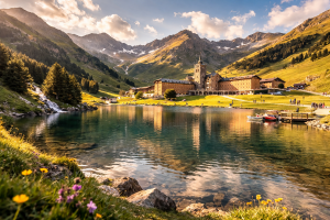 Montañas, praderas verdes y el santuario junto al lago forman una de las imágenes más icónicas del Pirineo catalán.